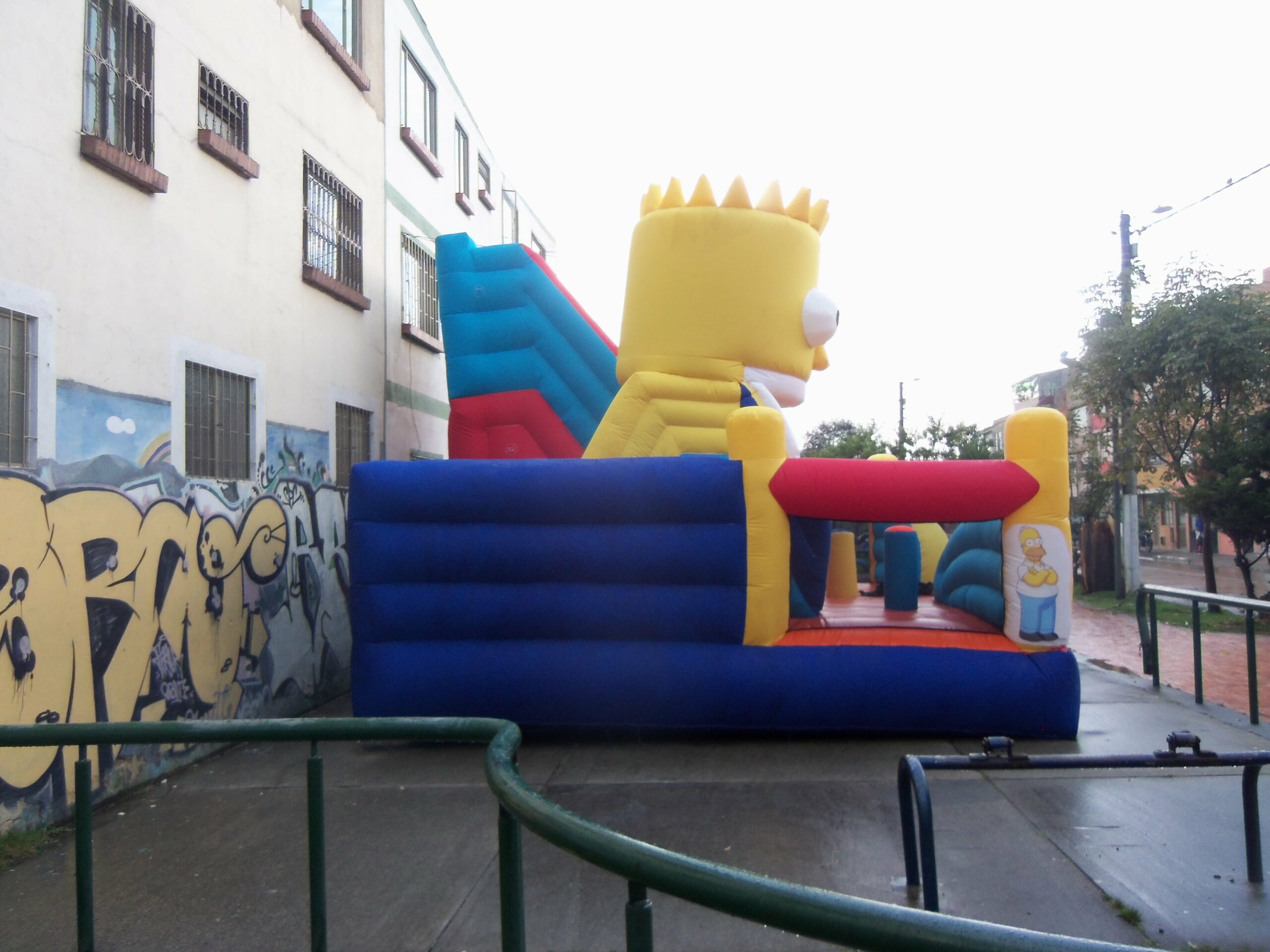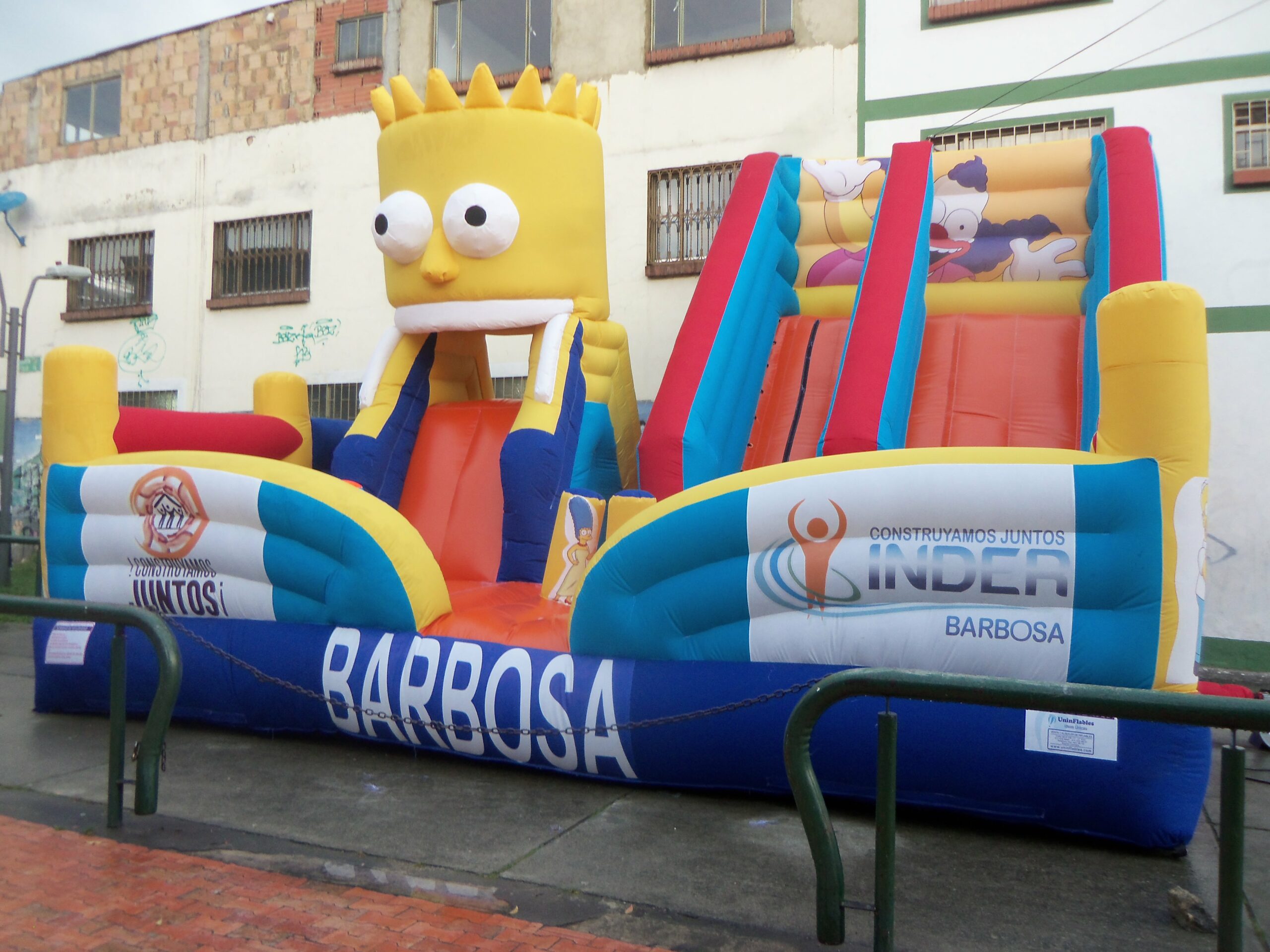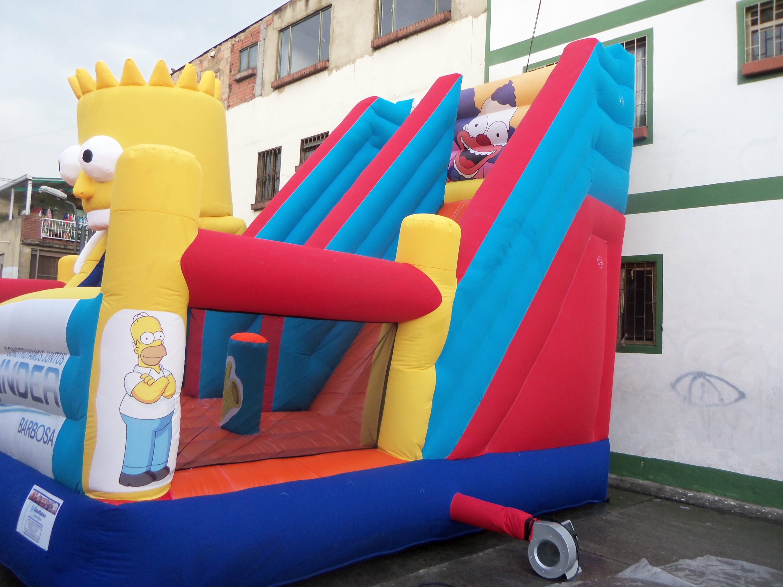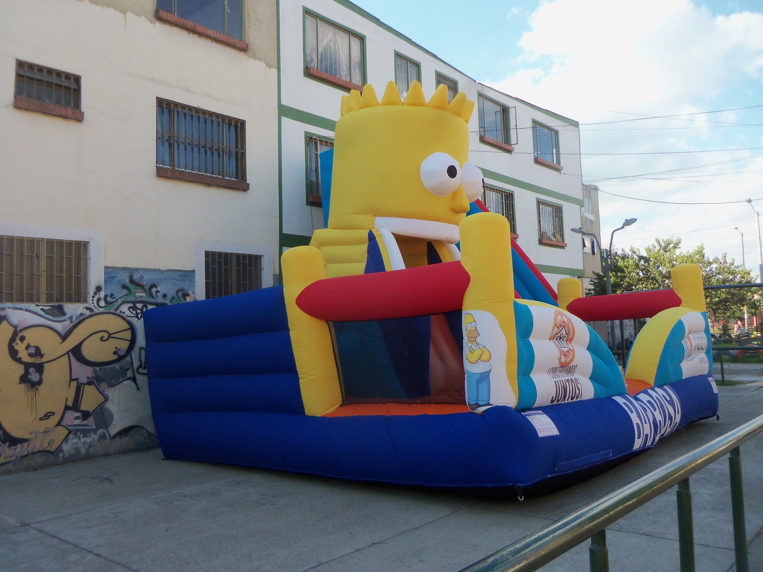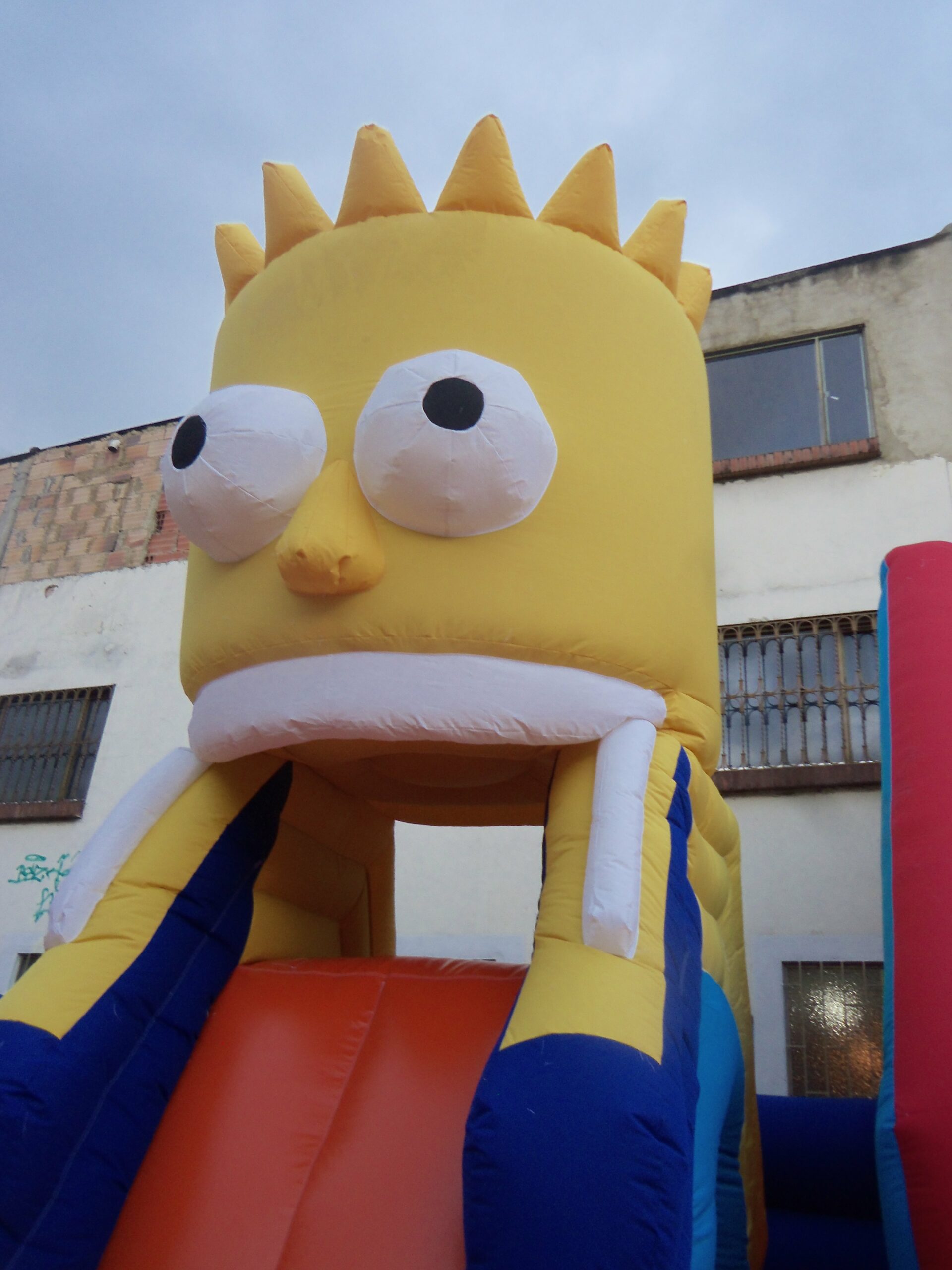El Tobogán Inflable Bartolandia es un inflable lleno de diversión y aventura, inspirado en el icónico personaje de Bart Simpson. Su diseño único incorpora una gran cabeza inflable en un lateral, cuya boca simula un tobogán, permitiendo que los niños se deslicen a través de ella en una experiencia emocionante.