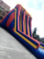 El diseño incorpora barreras inflables laterales, que garantizan seguridad y mantienen a los jugadores dentro del recorrido. La zona de aterrizaje es amplia y acolchonada, asegurando un final cómodo y seguro para los competidores. Además, su inclinación está calculada para ofrecer un descenso rápido pero controlado, maximizando la adrenalina sin comprometer la seguridad.