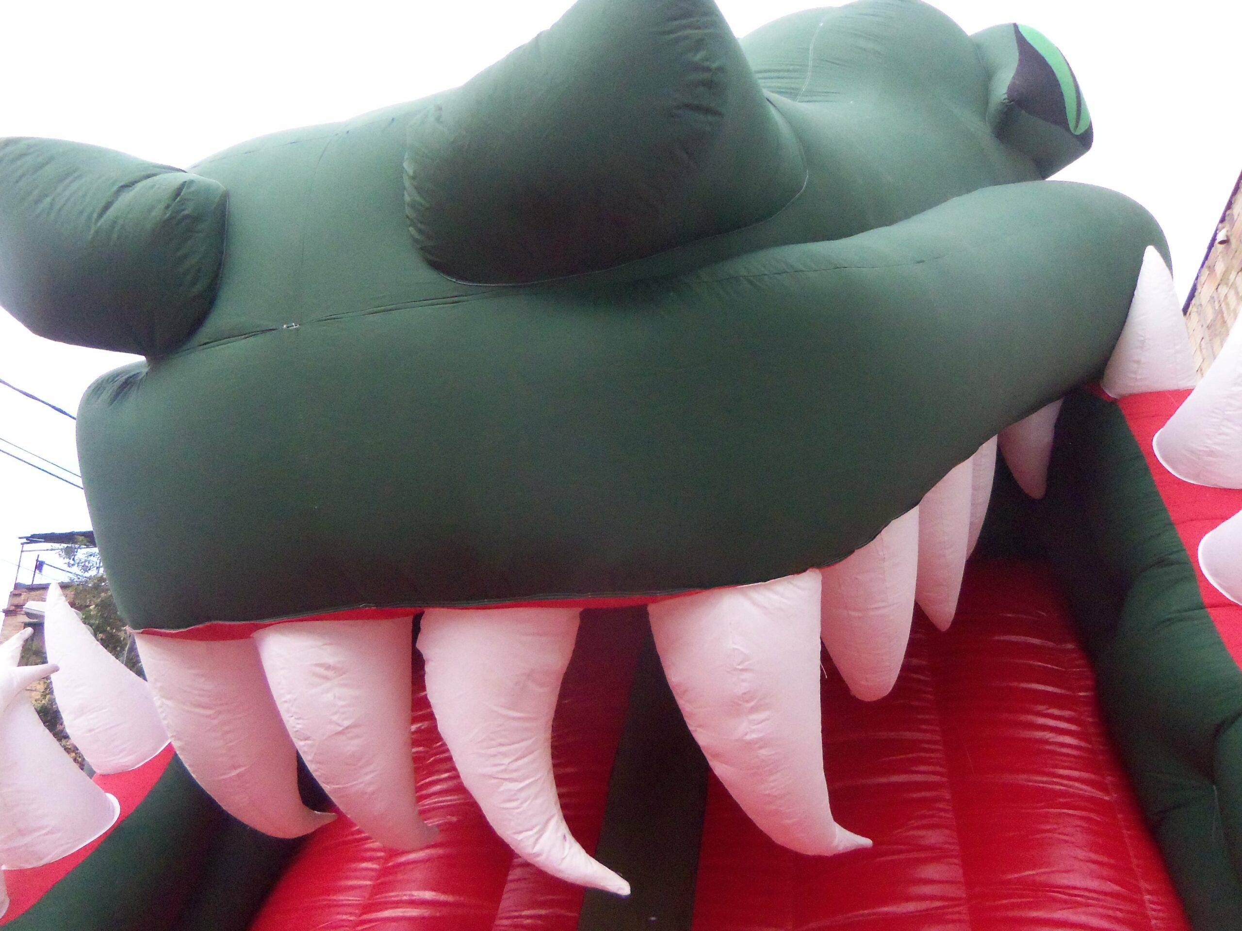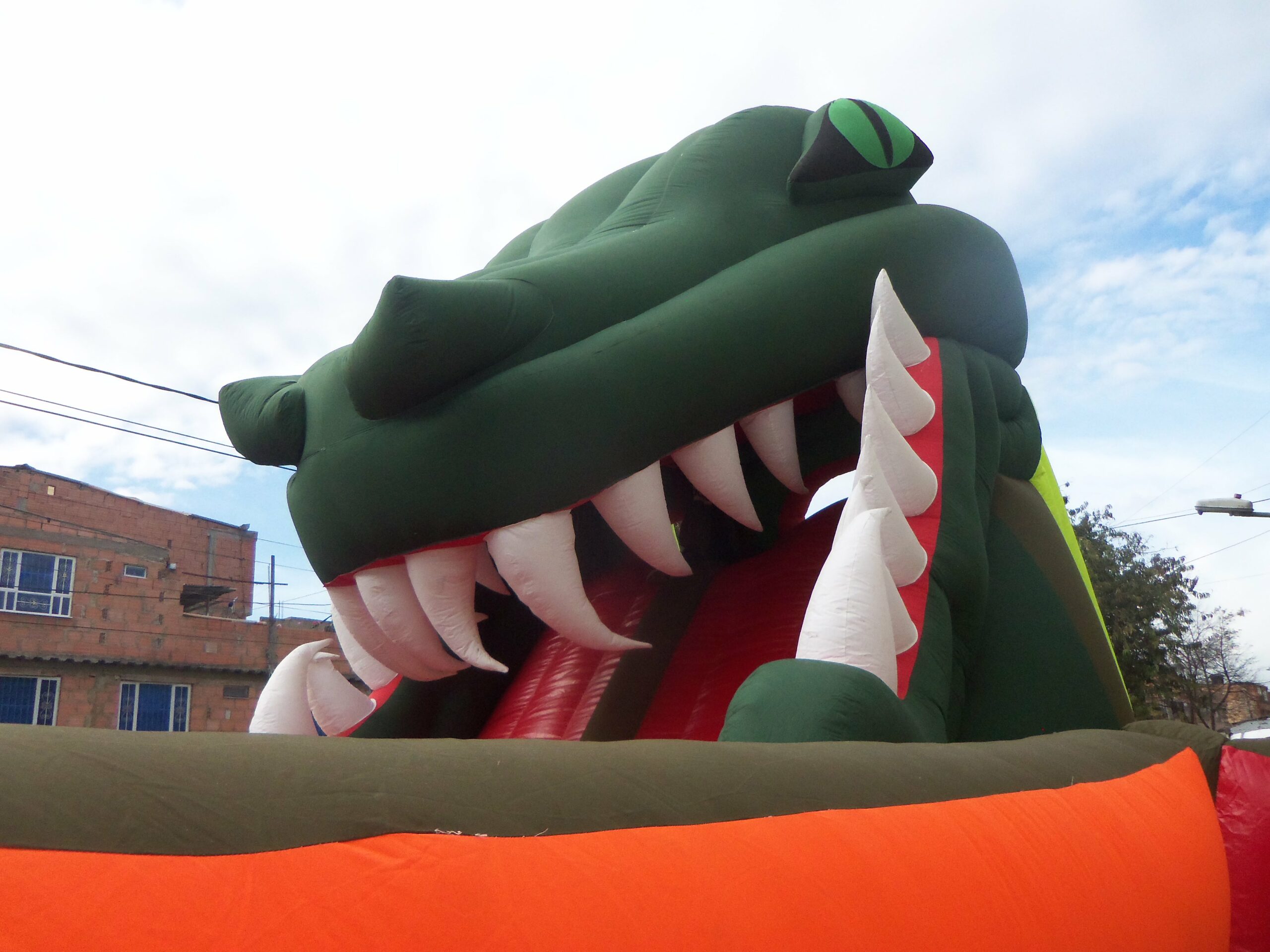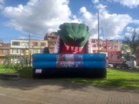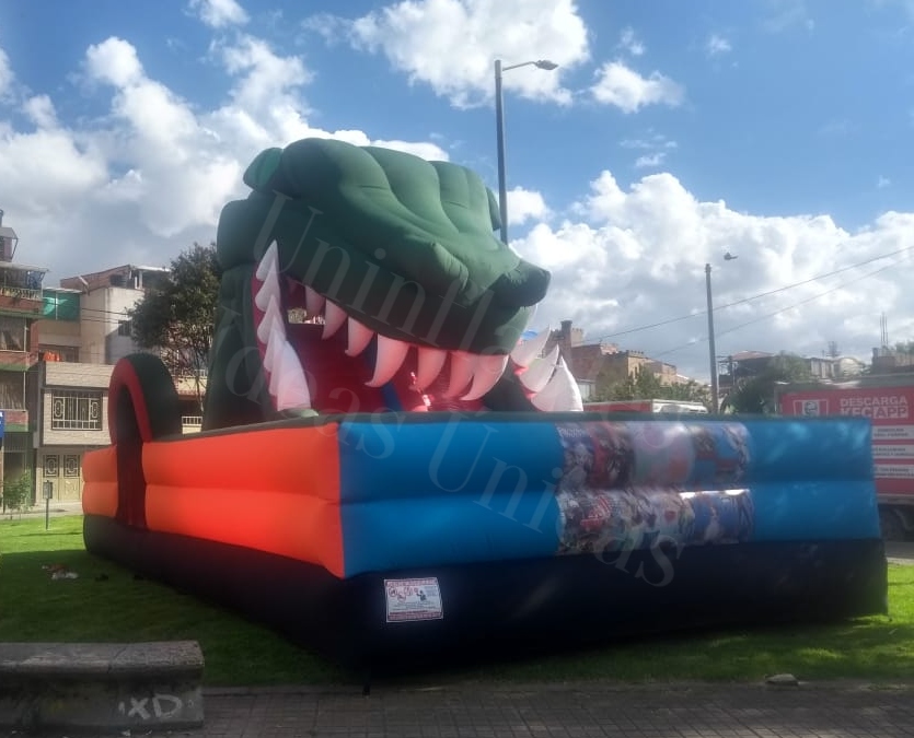 El Tobogán Inflable Desafío Jurásico es un inflable que transporta a los niños a una aventura prehistórica llena de emoción y desafíos. Su estructura cuenta con una zona de escalada en la parte trasera, donde los participantes deben ascender antes de lanzarse por dos toboganes frontales, que atraviesan la boca del imponente dinosaurio inflable.