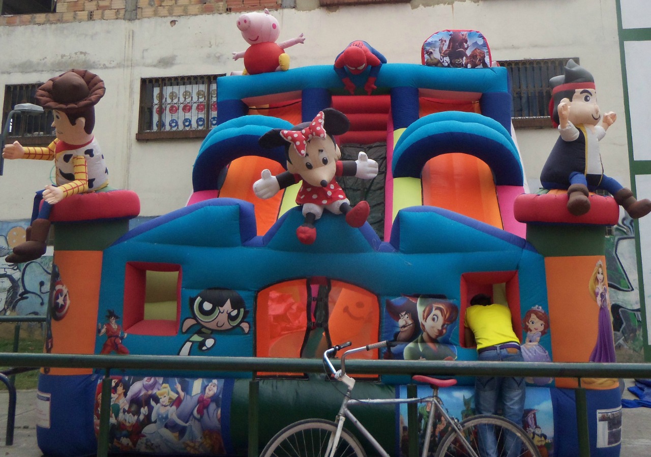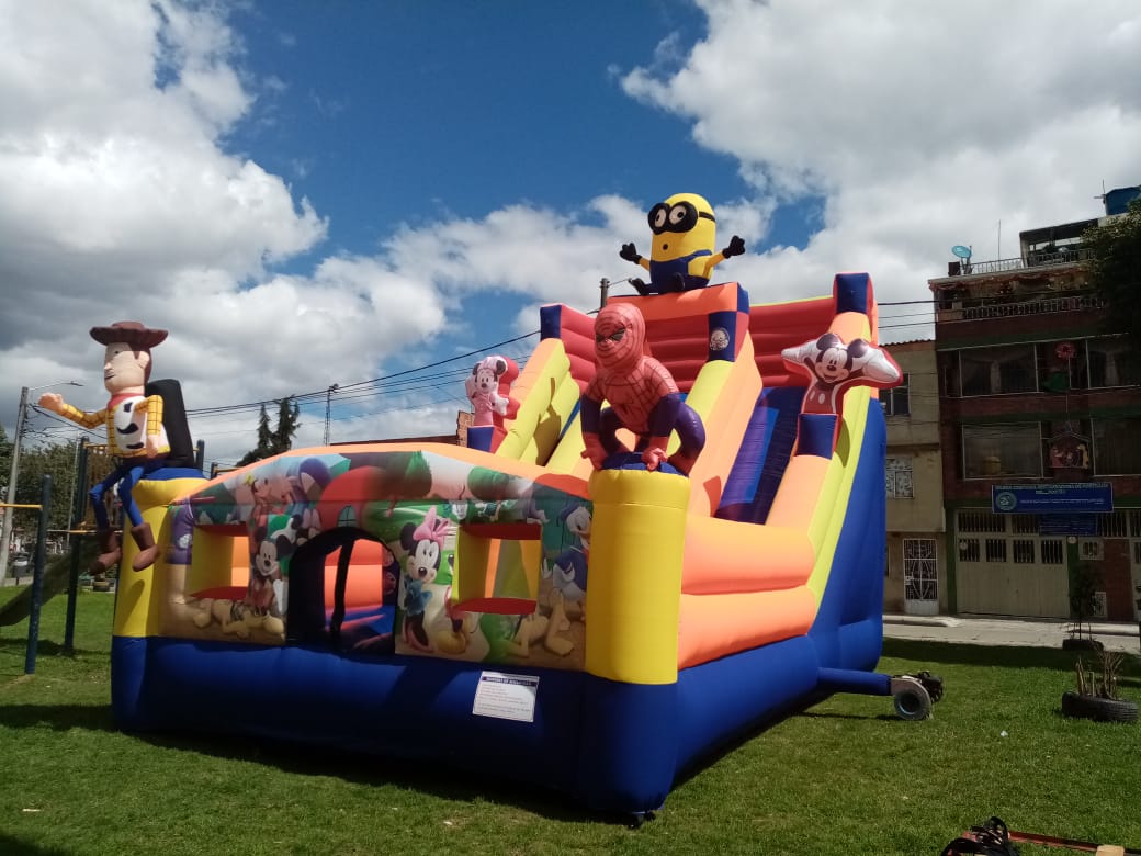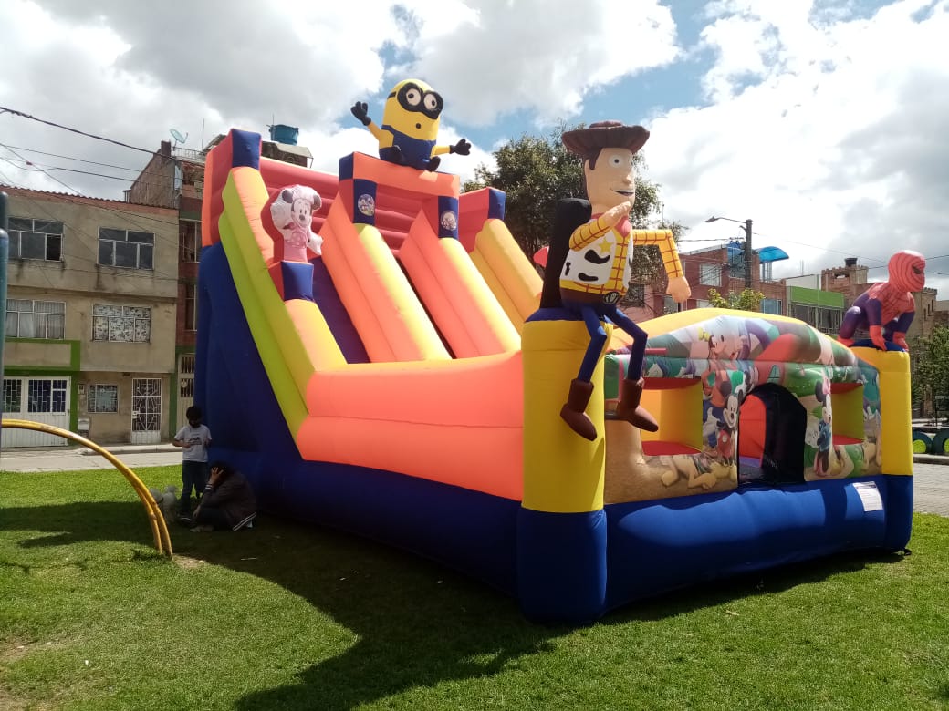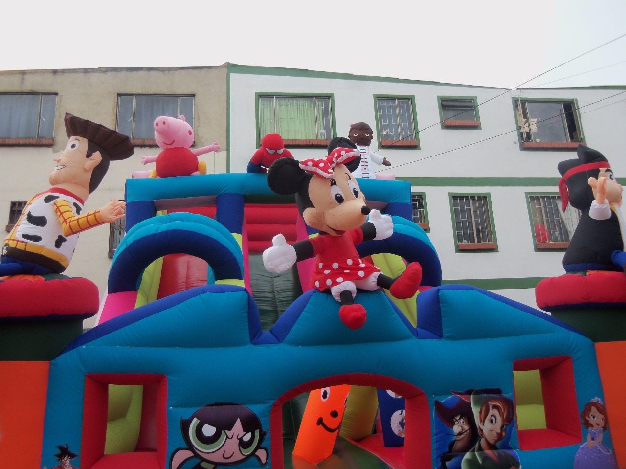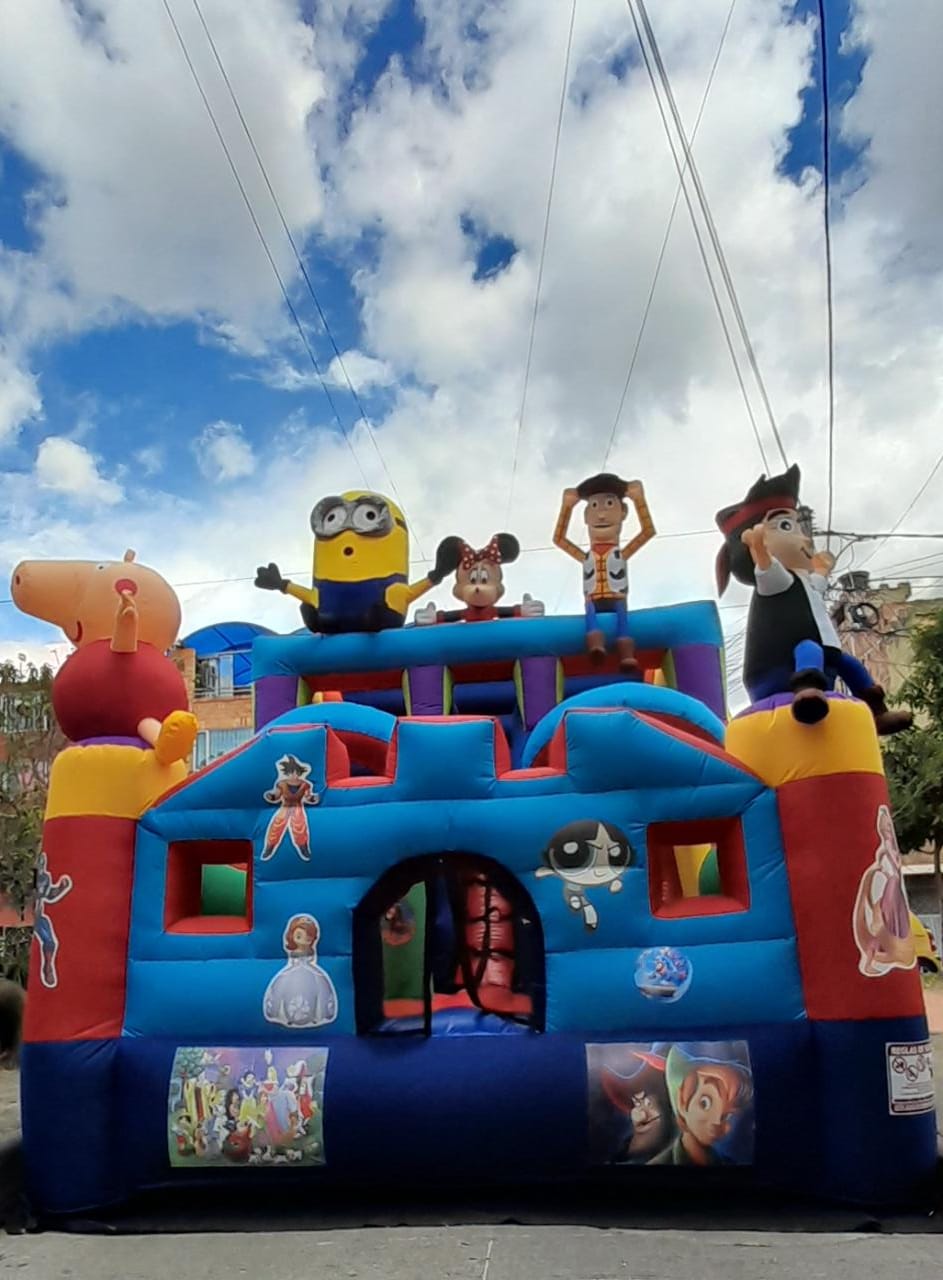 Además, cuenta con un colchón saltarín con elementos interactivos, permitiendo que los niños disfruten de brincos dinámicos y juegos adicionales dentro del inflable. La parte superior está decorada con figuras inflables de personajes icónicos como Woody, Minnie Mouse y un Minion, reforzando la temática mágica y colorida.