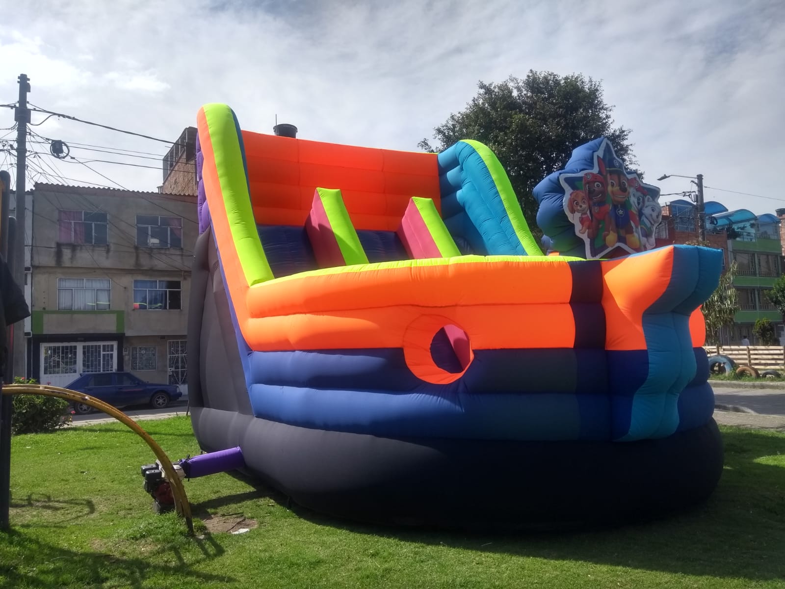 En la parte superior, un gran banner con los cachorros de la patrulla refuerza la temática, mientras que en la base, un colchón saltarín permite brincar antes del deslizamiento. Además, incorpora elementos interactivos, fomentando el juego y la exploración dentro del inflable.