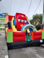 La estructura simula una pista de carreras con banderas a cuadros y líneas deportivas, reforzando la temática automovilística. En la entrada, imágenes de otros personajes como Mate complementan el diseño, brindando una experiencia visual envolvente. Además, cuenta con un colchón saltarín, ideal para brincar antes del deslizamiento, y elementos interactivos que enriquecen el juego dentro del inflable.